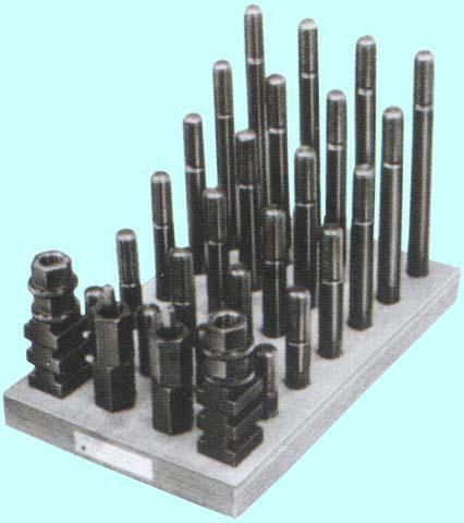 Набор предназначен для фиксации заготовок, деталей сложной формы при дальнейшей обработке на фрезерных, сверлильных и других станках , имеющих ширину паза 11.7-12мм на столе. В набор клиновых прижимов входят: Сухари (резьба М10х1,5) для станочных пазов 11.7мм - 6 шт. Гайка М10х1,5 с буртиком - 4 шт. Гайка М10х1,5 высокая - 4 шт. Клиновые опоры с рифлением - 6 шт. Прихват плоский с рифлением - 6 шт. Шпильки М10х1,5 длиной 75 мм - 4 шт. Шпильки М10х1,5 длиной 100 мм - 4 шт. Шпильки М10х1,5 длиной 125 мм - 4 шт. Шпильки М10х1,5 длиной 150 мм - 4 шт. Шпильки М10х1,5 длиной 175 мм - 4 шт. Шпильки М10х1,5 длиной 200 мм - 4 шт. Для удобства работы набор располагается на открытой деревянной подставке.