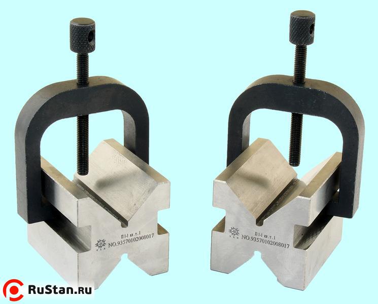 Изготовлены по Китайскому стандарту JB/T8047-95 с двумя призматическими выемками и скобой для фиксации заготовки. Предельные отклонения от параллельности и перпендикулярности + - 0,01мм. Фиксация детали осуществляется при помощи скобы с центральным винтом.